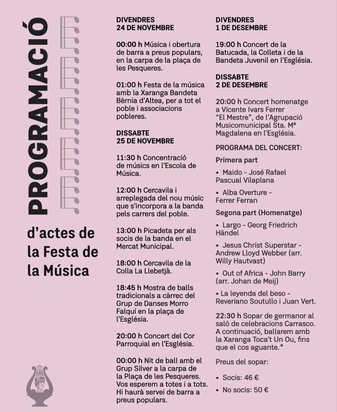 La programación empezará este viernes 24 de noviembre con fiesta, música y barra a precios populares en la plaza de les Pesqueres a partir de las 00:00h. Actuará la Xaranga Bandeta Bèrnia de Altea.