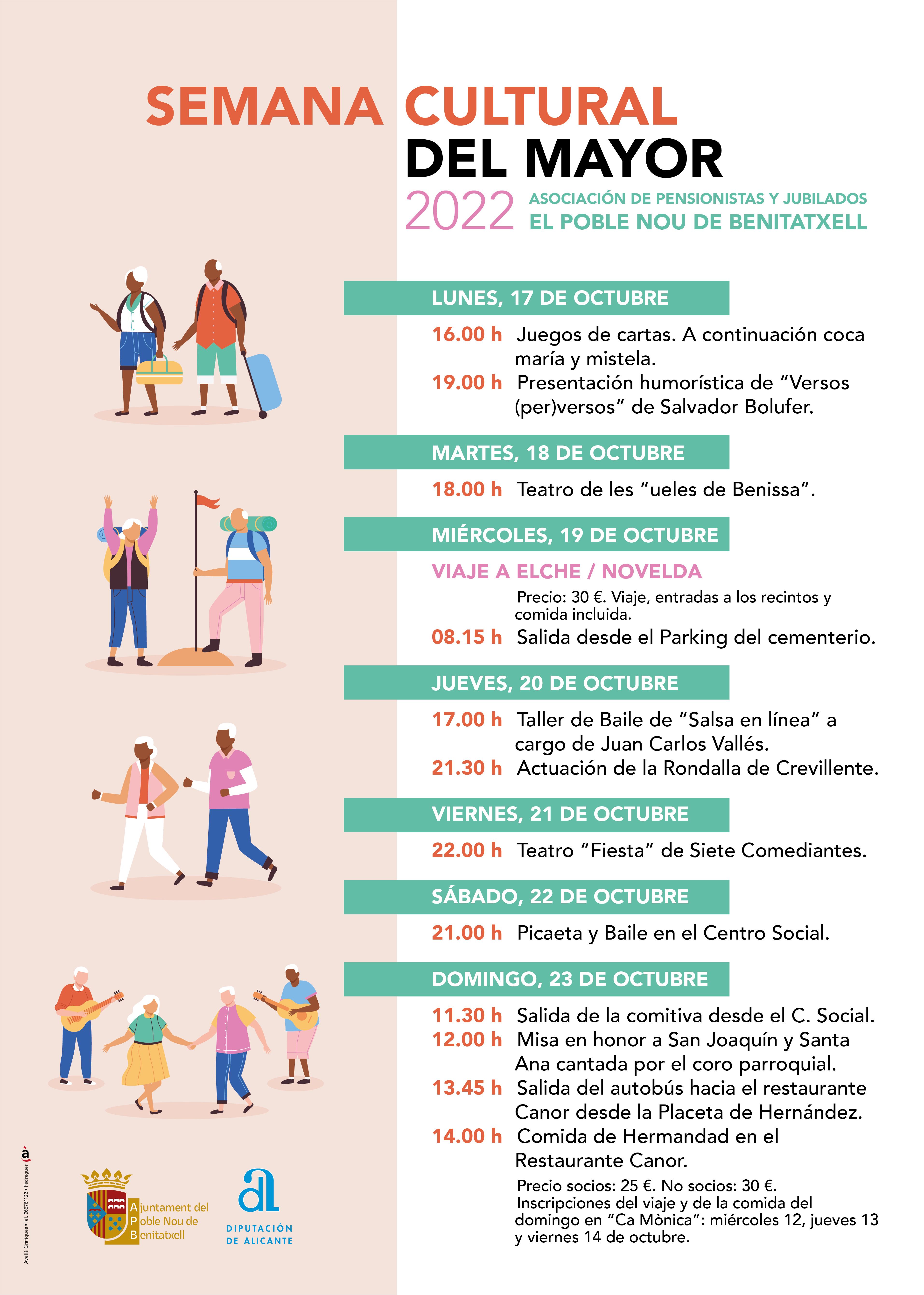 Los mayores del Poble Nou de Benitatxell también tienen su propia semana. La Asociación de Pensionistas y Jubilados, con la colaboración de la Concejalía del Mayor, ha organizado, del 17 al 23 de octubre, una amplia programación pensada especialmente para ellos. Los actos comienzan este lunes en el Centro Social con una sesión de cartas y merienda, y la presentación humorística de ‘Versos (per)versos’, de Salvador Bolufer.