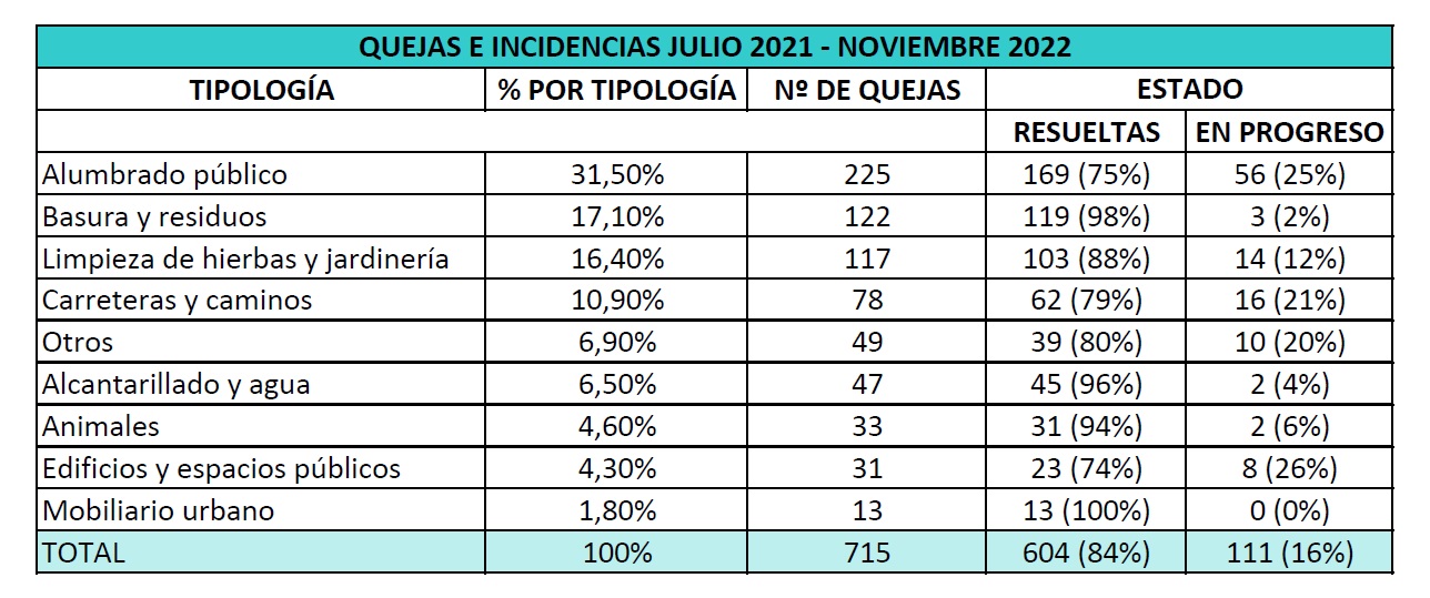 En total, entre el 1 de julio de 2021 y el 30 de noviembre de 2022, se han recibido 715 avisos de quejas o incidencias, de las cuales se han resuelto el 84%, o lo que es lo mismo, un total de 604. Esta tasa de demandas resueltas se ha incrementado más de 20 puntos respecto al año pasado, cuando el porcentaje de quejas atendidas era del 62%. En la siguiente tabla se pueden observar las quejas desglosadas por número, tipologías y su ratio de resolución.