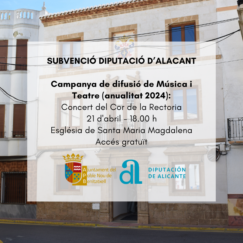 Campanya de difusió de Música i Teatre. Anualitat 2024 de l’Exma. Diputació Provincial d’Alacant. Concert del Cor de la Rectoria. 21 d’abril de 2024 a les 18.00 h. Església de Santa Maria Magdalena. Accés gratuït.
