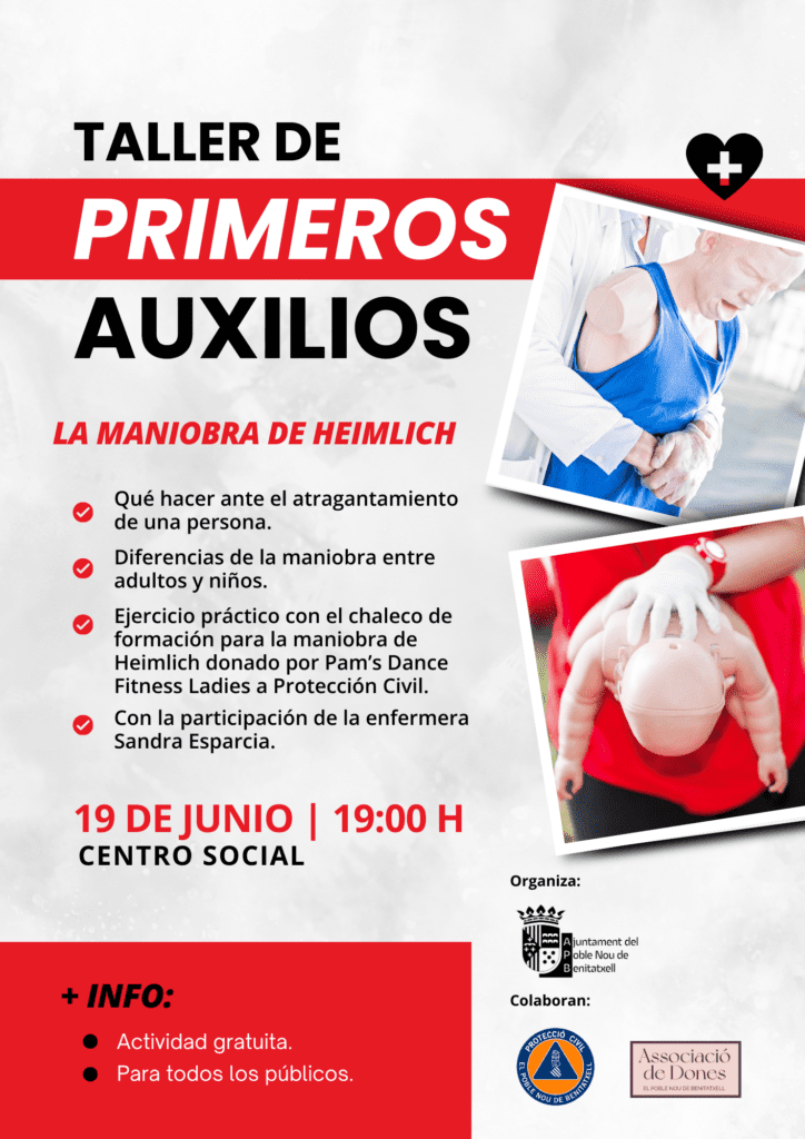 El Ayuntamiento, con la colaboración de Protección Civil, la Asociación de Mujeres del Pueblo Nuevo de Benitatxell y la enfermera Sandra Esparcia, organiza este mes de junio un taller de primeros auxilios sobre cómo realizar correctamente la maniobra de Heimlich ante casos de engarces.