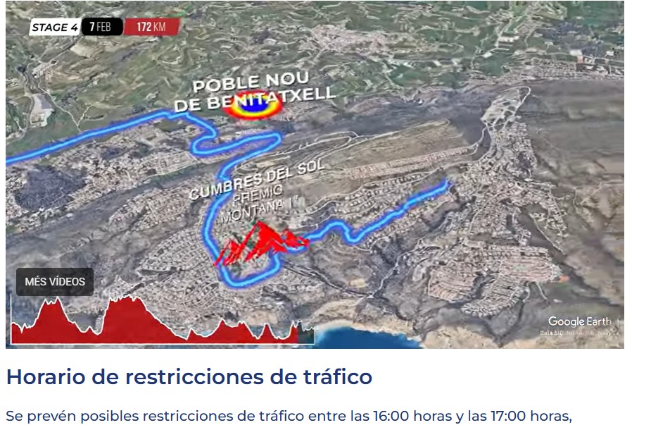 La Vuelta a la Comunitat Valenciana pasará por el municipio el próximo sábado 7 de febrero, entre las 16.45 y las 17.15h (pero el tráfico estará restringido a partir de las 16h), por Cumbre del Sol y las calles Assegador, Pou, Mayor, la Pau y avenida de Alicante. La etapa dará inicio a las 12.30h en La Nucia y seguirá hasta la Marina Alta, donde pasará por municipios vecinos como Parcent, Orba, Tormos, Sagra, Pego i les Valls, Beniarbeig, Pedreguer, Alcalalí, Xaló, Calp, Benissa y Teulada Moraira, donde estará la meta.
