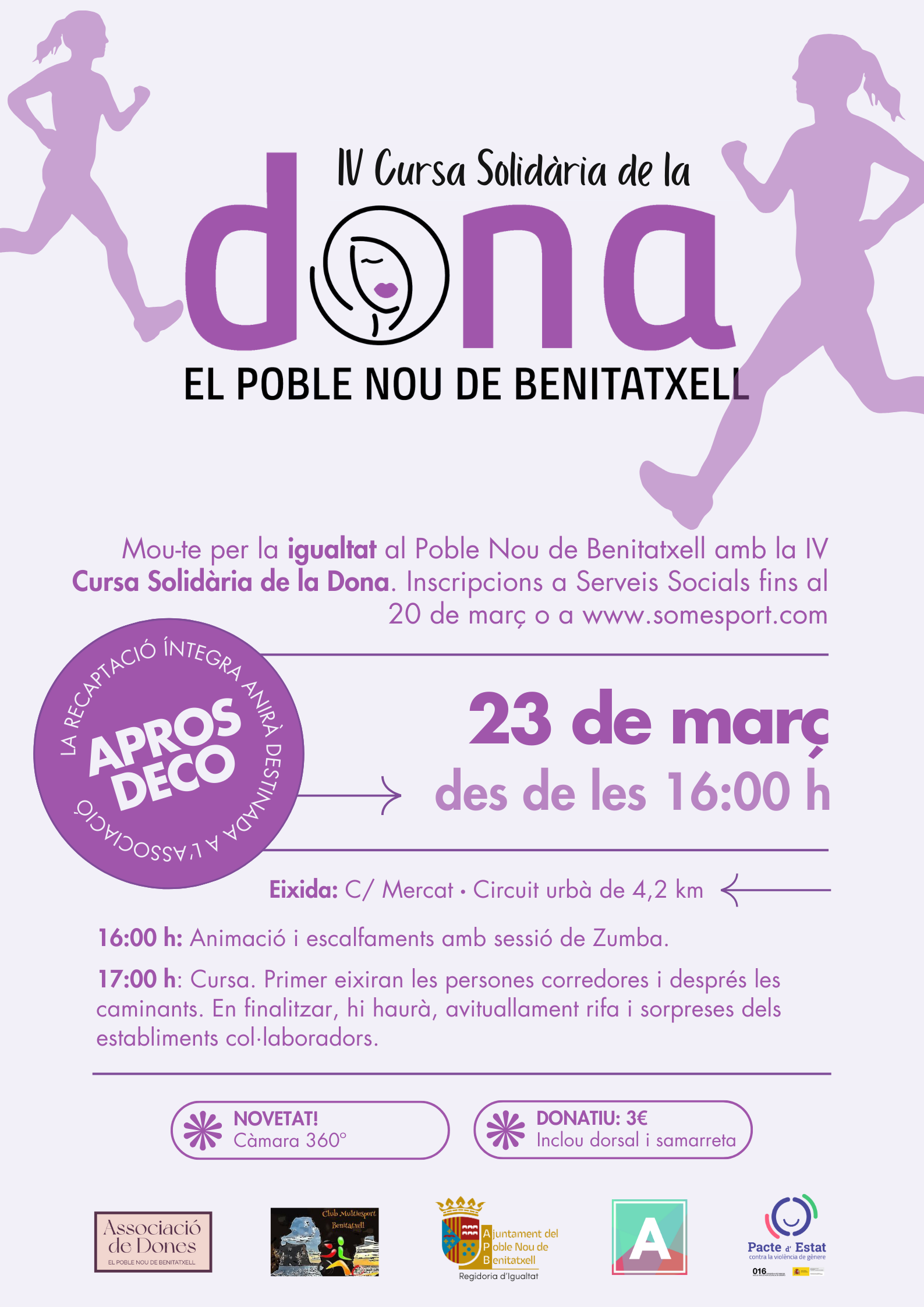 El Poble Nou de Benitatxell se mueve un año más por la igualdad. El sábado 23 de marzo, a partir de las 16:00h en la plaza del Mercat, se celebrará la IV Cursa Solidària de la Dona con la colaboración del Club Multiesport Benitatxell y la Associació de Dones. Se apuesta un año más por poner énfasis en el componente solidario de la carrera, involucrando en su organización y difusión a la asociación Aprosdeco, a la que irán a parar todos los beneficios de la venta de dorsales y camisetas.