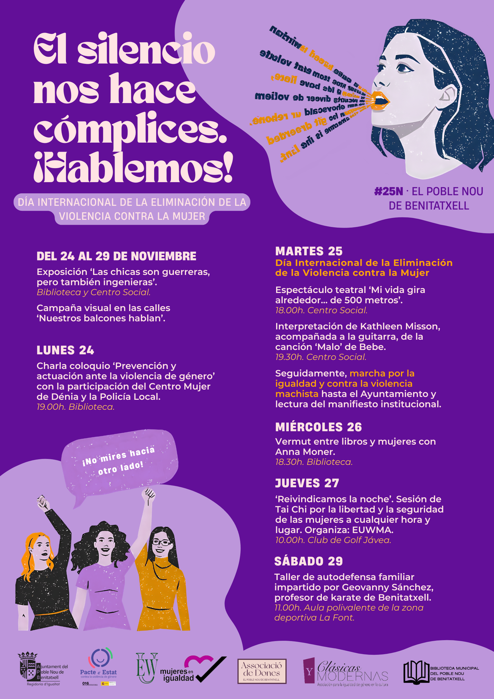 Con motivo del 25 de noviembre, Día Internacional para la Eliminación de la Violencia hacia la Mujer, el Departamento de Igualdad, a cargo de Isa Garrido, ha preparado un programa de actividades conmemorativas que se celebrarán del 24 al 29 de noviembre. En ella colaboran asociaciones y entidades como la Associació de Dones del Poble Nou de Benitatxell, la European Union of Women Marina Alta (EUWMA), Clásicas y Modernas y la Biblioteca Municipal.