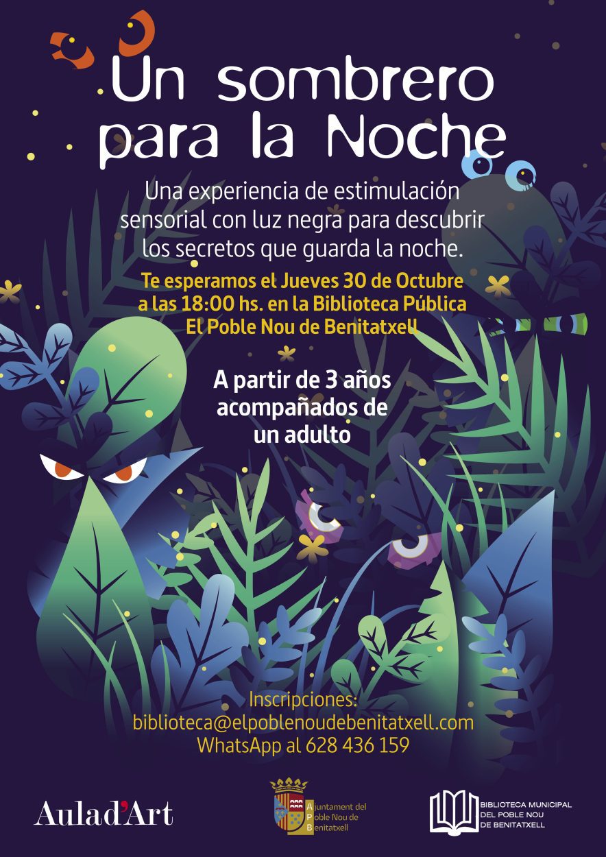 El jueves 30 de octubre, a las 18.00h, la Biblioteca acogerá la actividad ‘Un sombrero para la noche’, una experiencia de estimulación sensorial con luz negra para descubrir los secretos que guarda la noche. Las inscripciones se pueden realizar a través del correo biblioteca@elpoblenoudebenitatxell.com o por el WhatsApp al 628 436 159.
