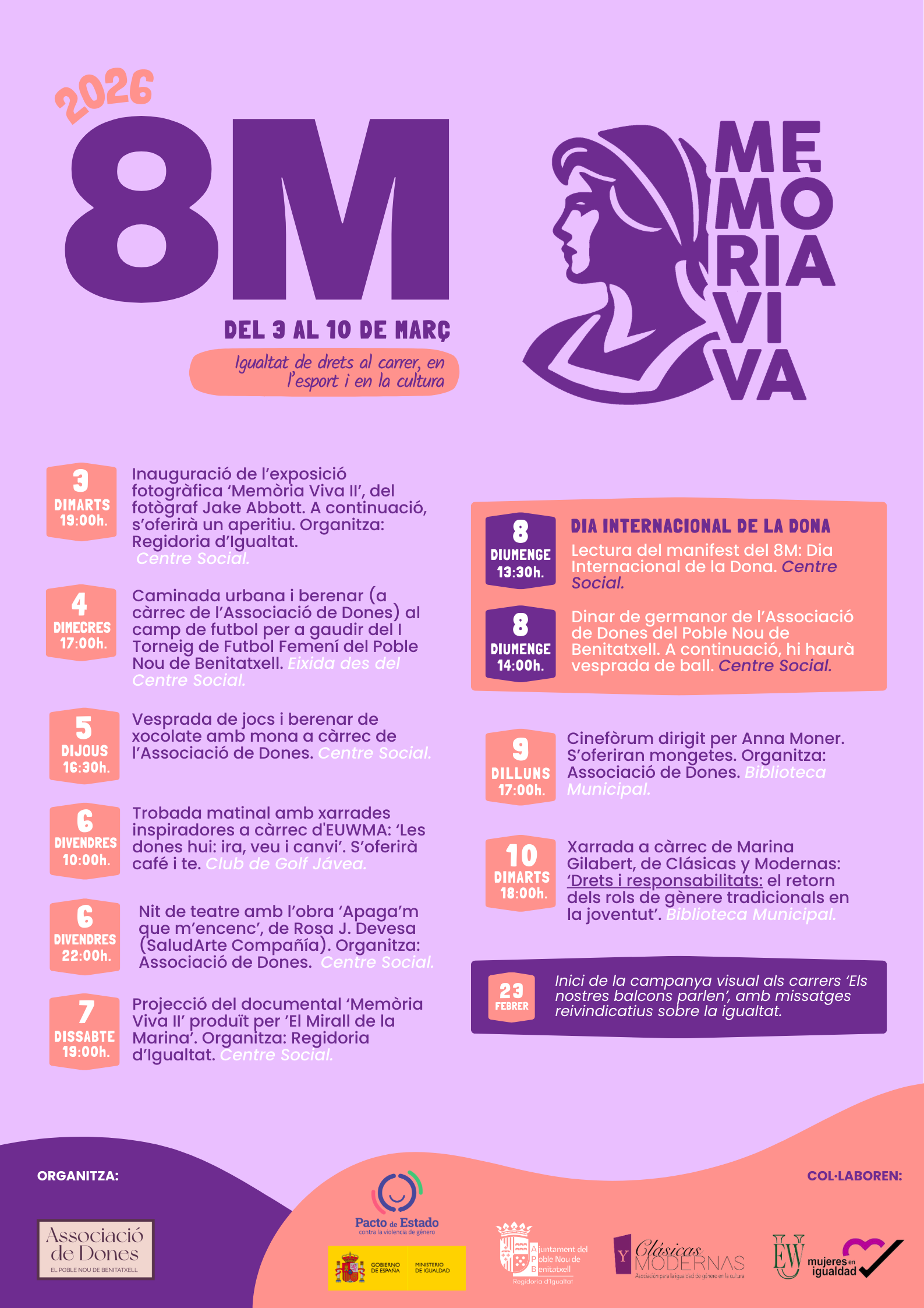 Des de la Regidoria d’Igualtat es convida a tota la ciutadania a participar en estos actes que combinen la memòria, la cultura i la reivindicació per a continuar construint un Poble Nou de Benitatxell més lliure i igualitari.