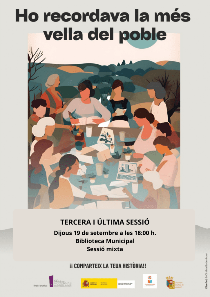 El dijous 19 de setembre, l’associació per a la igualtat de gènere en la cultura Clásicas y Modernas celebra la tercera i última sessió de la trobada ‘Ho recordava la més vella del poble’, que té com a objectiu recuperar la memòria oral de les dones del municipi. Tindrà lloc a les 18:00h a la Biblioteca Municipal i serà mixta.