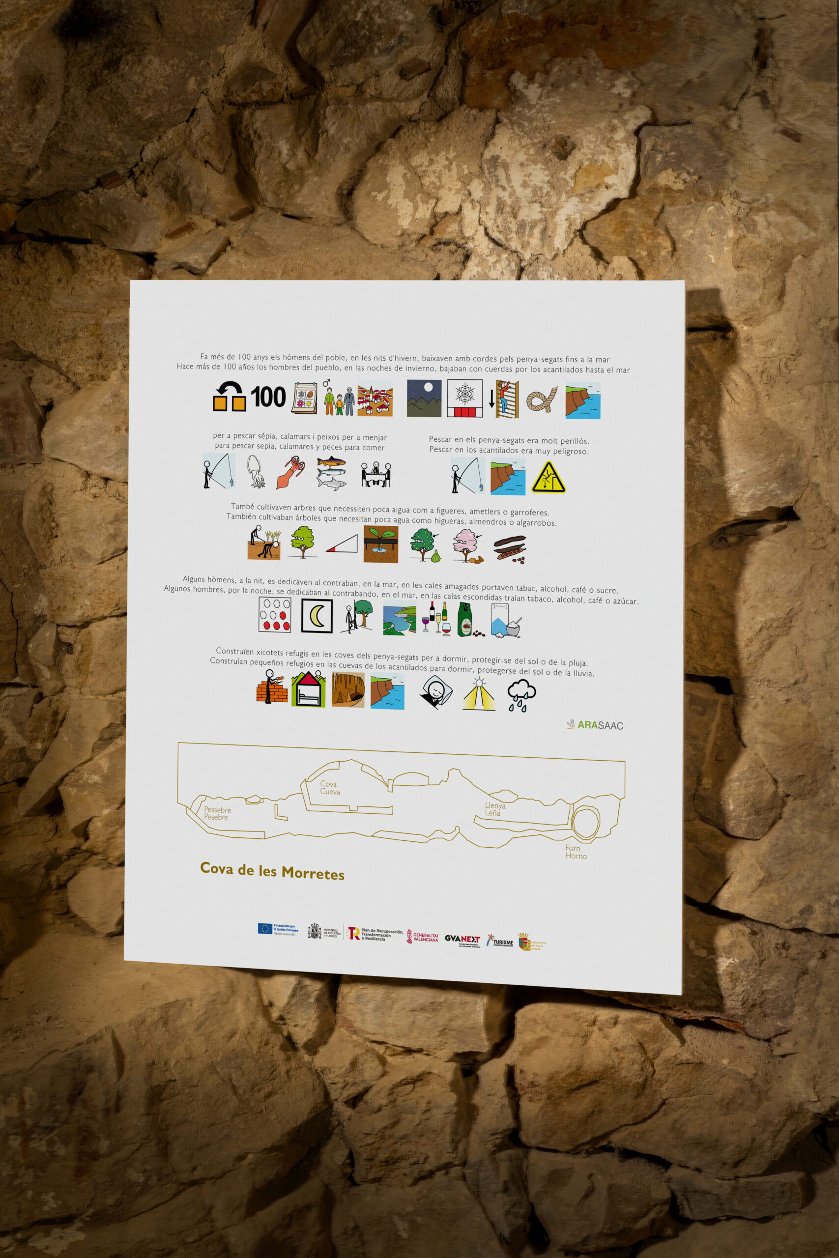 Amb esta última actuació de panelleria, finançada amb 18.000 euros del Pla de Sostenibilitat Turística en destí (Pla de Recuperació, Transformació i Resiliència PRTR finançat per la Unió Europea), es dona solidesa a este museu amb vista al Mediterrani, posant èmfasi en les activitats històriques vinculades a l’interior de la cova, la quadra i el forn, així com en l’activitat pesquera tradicional desenvolupada en les Pesqueres de Cingle.