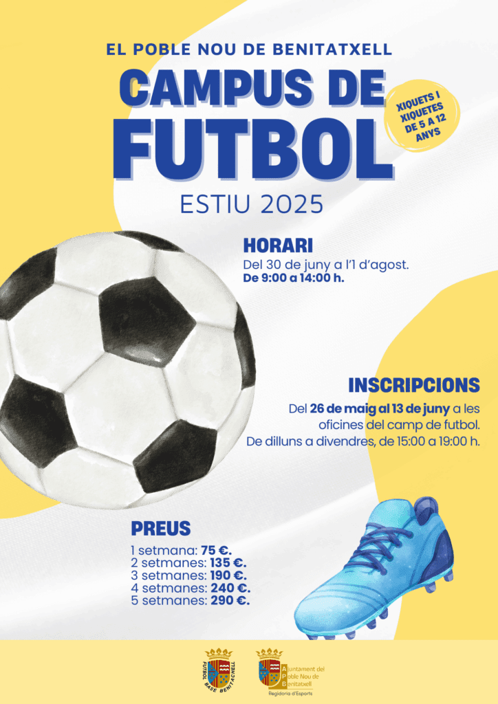 Per part seua, l’Escola Municipal de Futbol Base proposa el seu Campus de Futbol del 30 de juny a l’1 d’agost, amb un preu de 75 euros a la setmana, 135 euros dos setmanes, 190 euros tres setmanes, 240 euros 4 setmanes i 290 euros cinc setmanes. L’horari serà de 9.00 a 14.00h. Les inscripcions es poden realitzar del 26 de maig al 13 de juny en l’edifici del camp de futbol, de dilluns a divendres, de 15.00 a 19.00h.