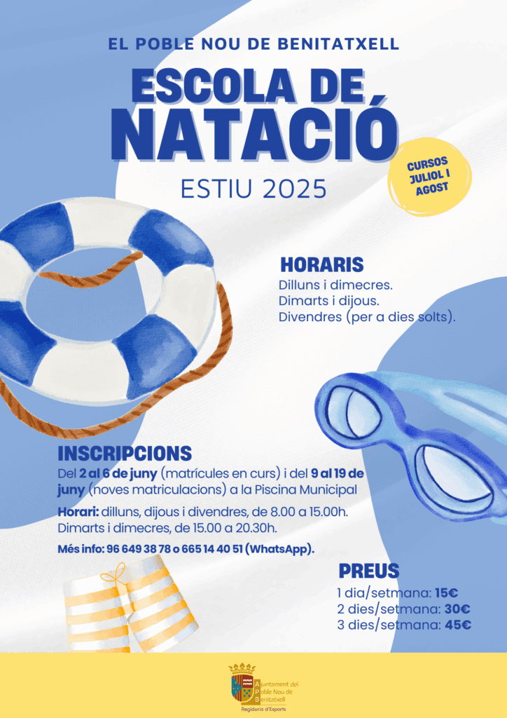 Les inscripcions s’obrin del 2 al 19 de juny en la Piscina Municipal (del 2 al 6 per a matrícules ja en curs i del 9 al 19 per a noves matriculacions) en els següents horaris: dilluns, dijous i divendres, de 8.00 a 15.00h; i dimarts i dimecres, de 15.00 a 20.30h. Per a més informació es pot contactar amb el telèfon 96 649 38 78 o enviar un WhatsApp al 665 14 40 51.
