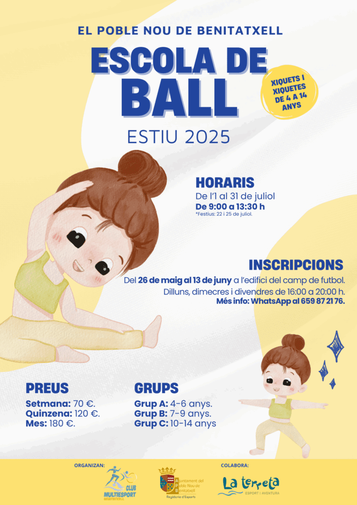 El Club Multiesport Benitatxell ofereix l’Escola multiesportiva de l’1 de juliol al 29 d’agost (amb un preu de 14 euros el dia solt, 70 euros una setmana, 120 euros la quinzena i 180 euros un mes) i l’Escola de Ball de l’1 al 31 de juliol (70 euros una setmana, 120 euros la quinzena i 180 euros un mes). En els dos casos, l’horari serà de 9.00 a 13.30h, i la multiesportiva tindrà a més servei de guarda de 13.30 a 14.30h. L’escola tancarà els dies festius: 22 i 25 de juliol i 15 d’agost.
