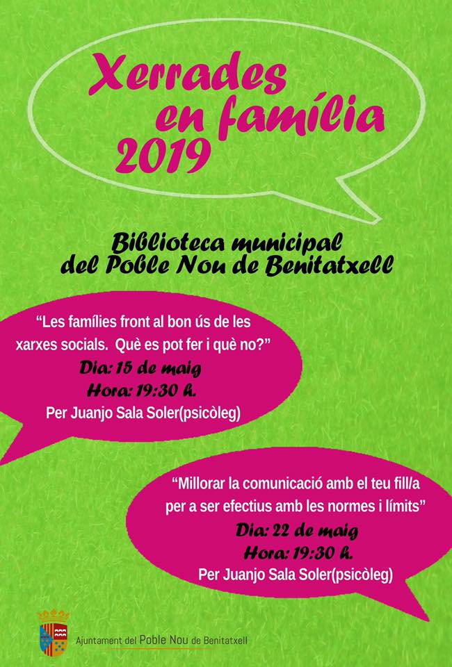 Un año más el Departamento de Servicios Sociales del Poble Nou de Benitatxell ha organizado el ciclo de sesiones de las charlas en familia, la primera será el 15 de mayo a las 19.30 horas y la segunda el 22 de mayo a la misma hora en la Biblioteca. En las sesiones se hablará de cómo hacer frente al buen uso de las redes sociales y de cómo mejorar la comunicación con los hijos e hijas para hacer más efectivas las normas y límites. Las sesiones estarán impartidas a cargo del psicólogo Juanjo Sala.