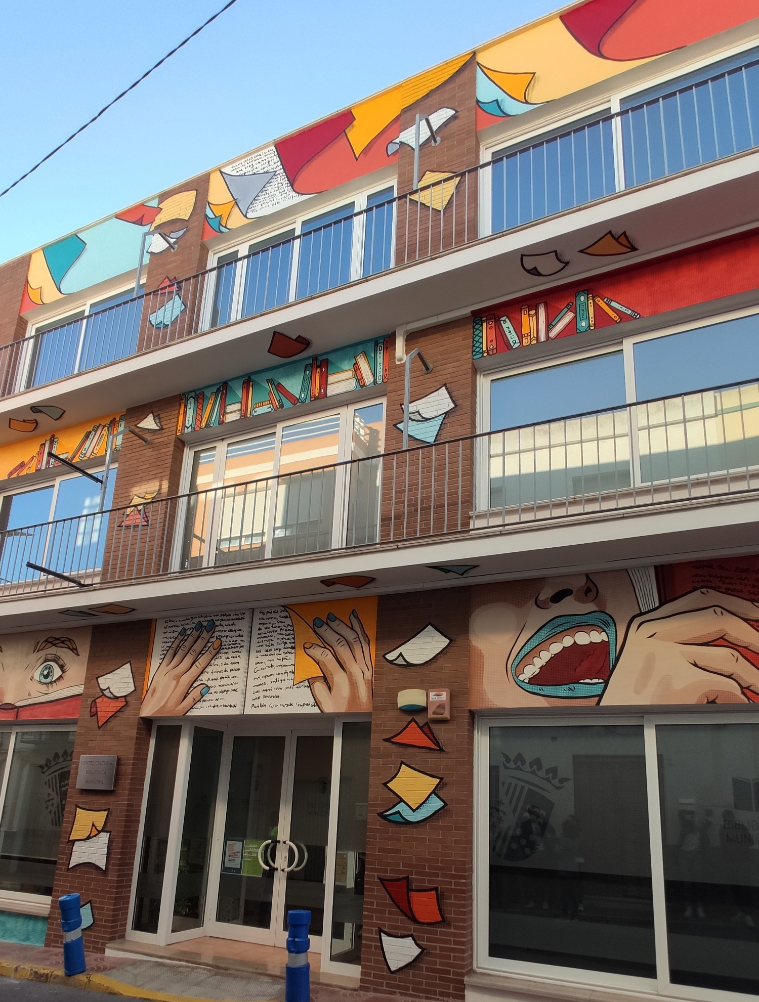 La fachada de la Biblioteca de El Poble Nou de Benitatxell luce desde el sábado llena de colorido. Es difícil no alzar la cabeza para admirar la obra de arte que ha trazado el artista Giacomoerre, ganador del Premio Concurso de Diseño Mural de la Biblioteca Municipal, galardonado con una cuantía económica de 1.000 euros.