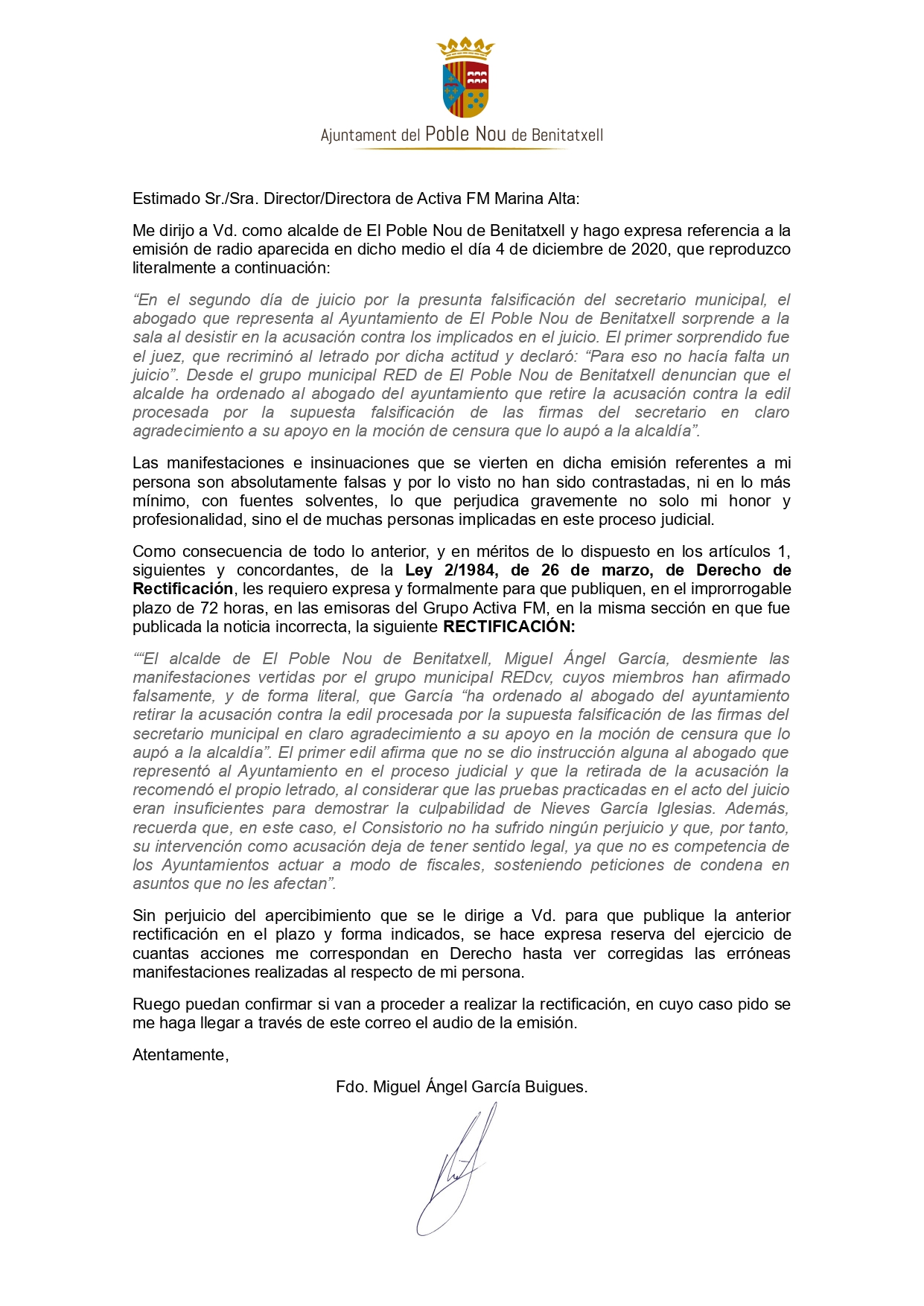 Después de diversas ocasiones en las que, de forma amistosa y en privado a través de burofax y correo electrónico, se le ha requerido desde la Alcaldía del Ayuntamiento al grupo de emisoras Activa FM la rectificación de noticias falsas o sesgadas (acogiéndose al Derecho de Rectificación de la Ley 2/1984, de 26 de marzo); y tras no haber obtenido respuesta alguna por su parte, el Consistorio se ve obligado a hacer pública la última demanda de rectificación, relacionada con el juicio por la presunta falsificación de la firma del secretario municipal.