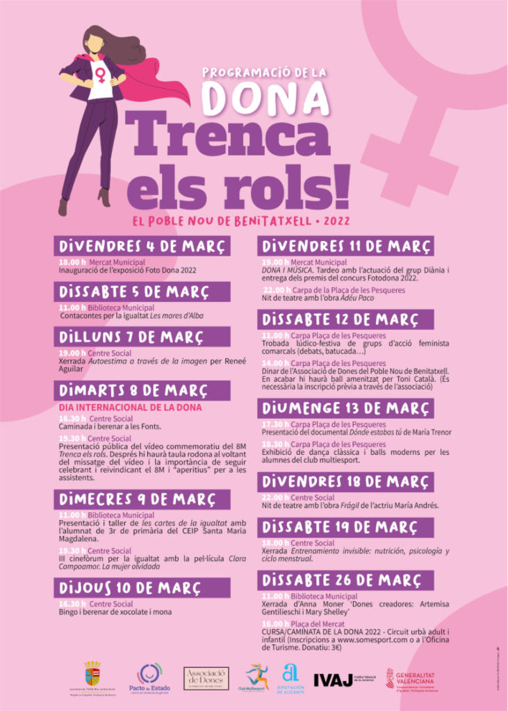 El martes 8 de marzo, como ya se hizo el año pasado, se presentará el video reivindicativo que, bajo el título ‘Rompe los roles’, “quiere poner de manifiesto la necesidad de acabar con los estereotipos de género tradicionalmente impuestos por el patriarcado a las mujeres, que muchas veces las oprimen. Para que puedan ser, amar, convivir y dedicarse a lo que quieran, desarrollando sus capacidades como personas, no en función del género con el cual han nacido”, ha señalado Bisquert. La presentación oficial será a las 19:30h en el Centro Social, y después habrá mesa redonda para debatir el mensaje del video y un pequeño aperitivo para las y los asistentes. El audiovisual se compartirá también en las redes sociales y los canales oficiales del Ayuntamiento. Ese día habrá también caminata y merienda en el nuevo parque de Les Fonts a las 16:30h.