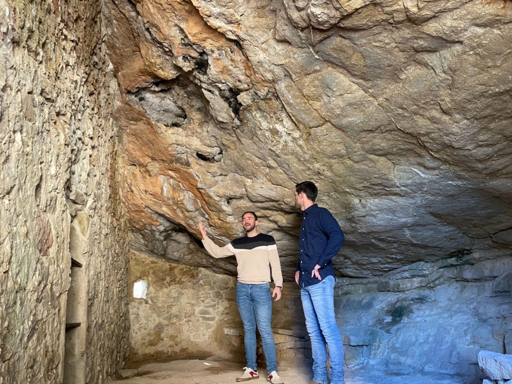 Después se empezó con la rehabilitación de las paredes, el techo y los elementos interiores, como el pesebre o la zona de bancos corridos. La parte del techo unida a la roca madre era una de las más deterioradas. Se había desprendido por las filtraciones de agua, que iban deshaciendo el mortero de cal que habían utilizado para pegar las piedras. Eso hacía que se fuera desplazando el muro de la cueva y que hubiera piedras sueltas. De forma meticulosa, se fueron sacando las piedras de la construcción original para volverlas a utilizar en la reconstrucción, y después se sellaron con los mismos materiales, en el caso de las paredes con mortero de cal.