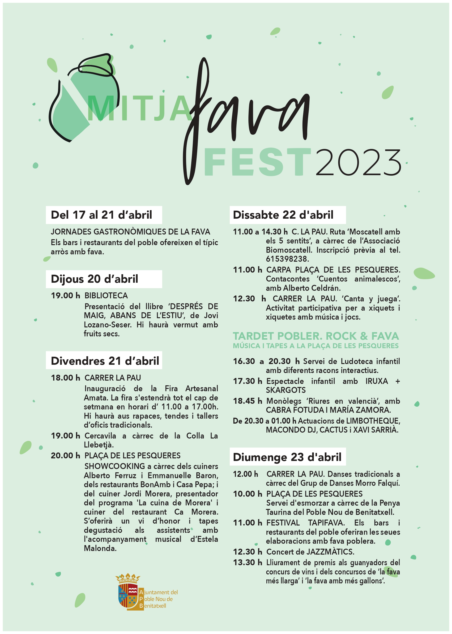 El domingo 24 de abril, el Mitjafava Fest se despedirá con una gran jornada con actividades como las danzas tradicionales del Grup de Danses Morro Falquí, el servicio de almuerzo a cargo de la Peña Taurina y el Festival Tapifava con precios populares, en el que los bares y restaurantes del pueblo ofrecerán varias elaboraciones culinarias con haba poblera. A las 12:30h actuará el grupo Jazzmàtics, y para rematar, a las 13:30h se librarán los premios a las personas ganadoras del concurso de vinos, el haba más larga y el haba con más ‘gallons’ (semillas).