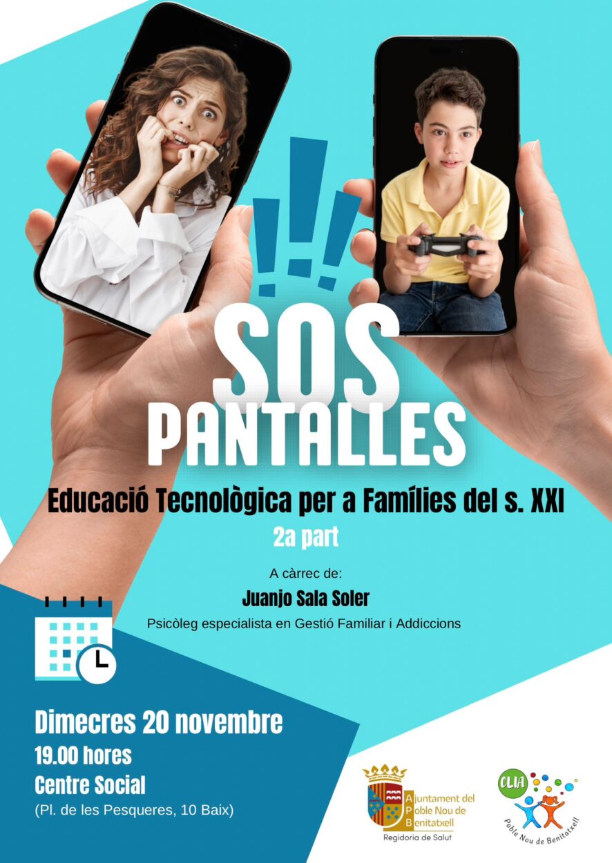 La próxima semana, el miércoles 20 de noviembre, a las 19.00h en el Centro Social, las concejalías de Infancia y Servicios Sociales, conjuntamente a través del Departamento de Psicología, han organizado la segunda parte del taller para familias ‘S.O.S Pantallas’, que ya contó con gran éxito de participación en su primera edición el pasado mes de mayo. Impartido por el psicólogo Juanjo Sala, especialista en gestión familiar y adicciones, tratará de dar las claves y la información necesaria a las familias para saber cómo abordar la adicción a las pantallas, una problemática cada vez más extendida entre los niños, niñas y adolescentes.