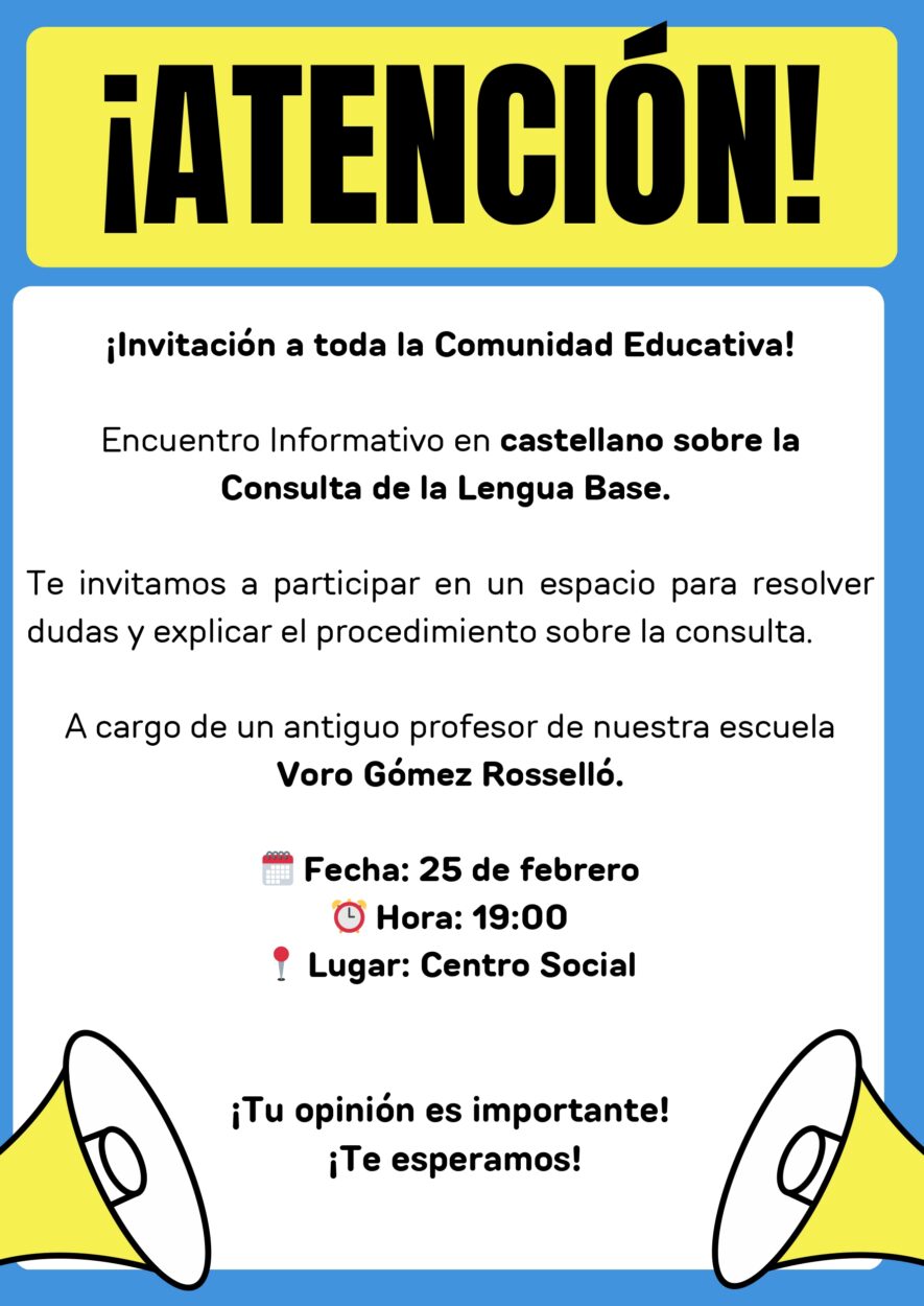 Precisamente el martes por la tarde, el Centro Social de El Poble Nou de Benitatxell l acogió una charla organizada por el AMPA del CEIP Santa María Magdalena y el Ayuntamiento sobre la ley de libertad educativa impartida por Jaume Fullana, ex Director General de Política Educativa. Además, el próximo martes 25 de febrero, también a las 19.00h en el Centro Social, se celebrará otro encuentro en castellano sobre la consulta de la lengua base, la cual estará impartida por el ex profesor de la escuela del pueblo y ex coordinador de la Dirección General de Política Educativa Voro Gómez.