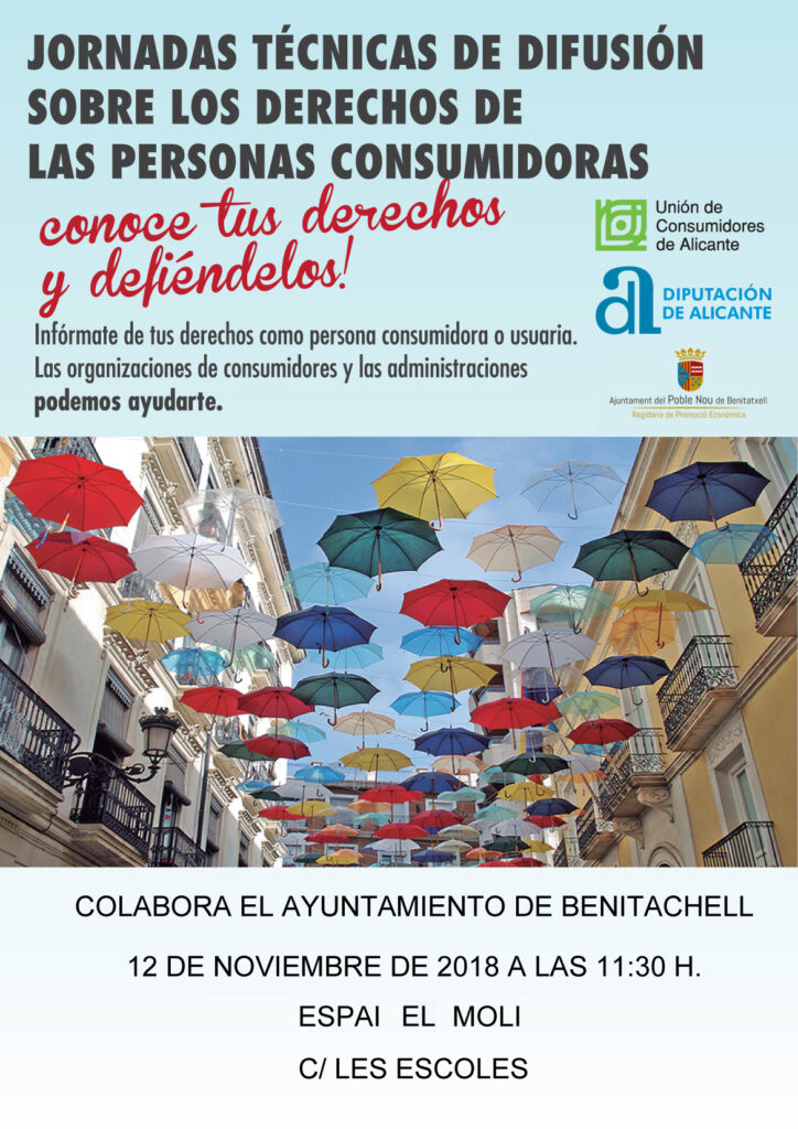 El Poble Nou de Benitatxell realizará junto con La Unión de Consumidores de Alicante y la Diputación de Alicante, una jornada técnica con el objetivo de servir de cauce para la adecuada información, formación y derechos de los consumidores. La charla abordara cuestiones como el derecho a la protección de la salud o seguridad, de los intereses económicos y sociales, el derecho a la indemnización de daños y la reparación de perjuicios sufridos. Por último, el derecho al a información correcta de los bienes o servicios y a la educación y divulgación en materia de consumo.