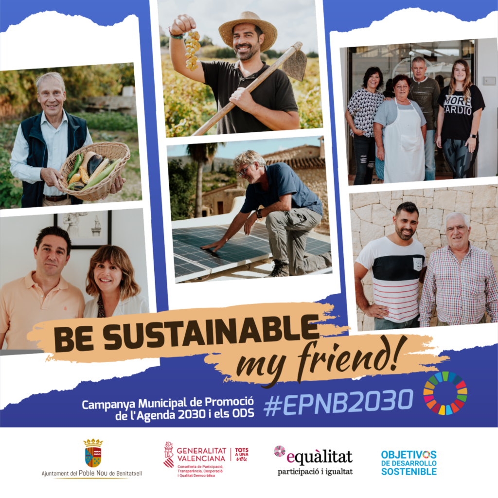 Es por este motivo que el consistorio ha impulsado la campaña municipal de promoción de la Agenda 2030 y los ODS “Be sustainable my friend!”, un proyecto que tiene como finalidad formar a la ciudadanía sobre los retos de futuro y hacer ver como estos se pueden canalizar a través de las acciones individuales y colectivas. De este modo, no solo se persigue la creación de una ciudadanía más informada y comprometida con los principios y valores promovidos en la Agenda 2030, sino que además se fomenta una comunicación bidireccional del consistorio con la ciudadanía poblera.
