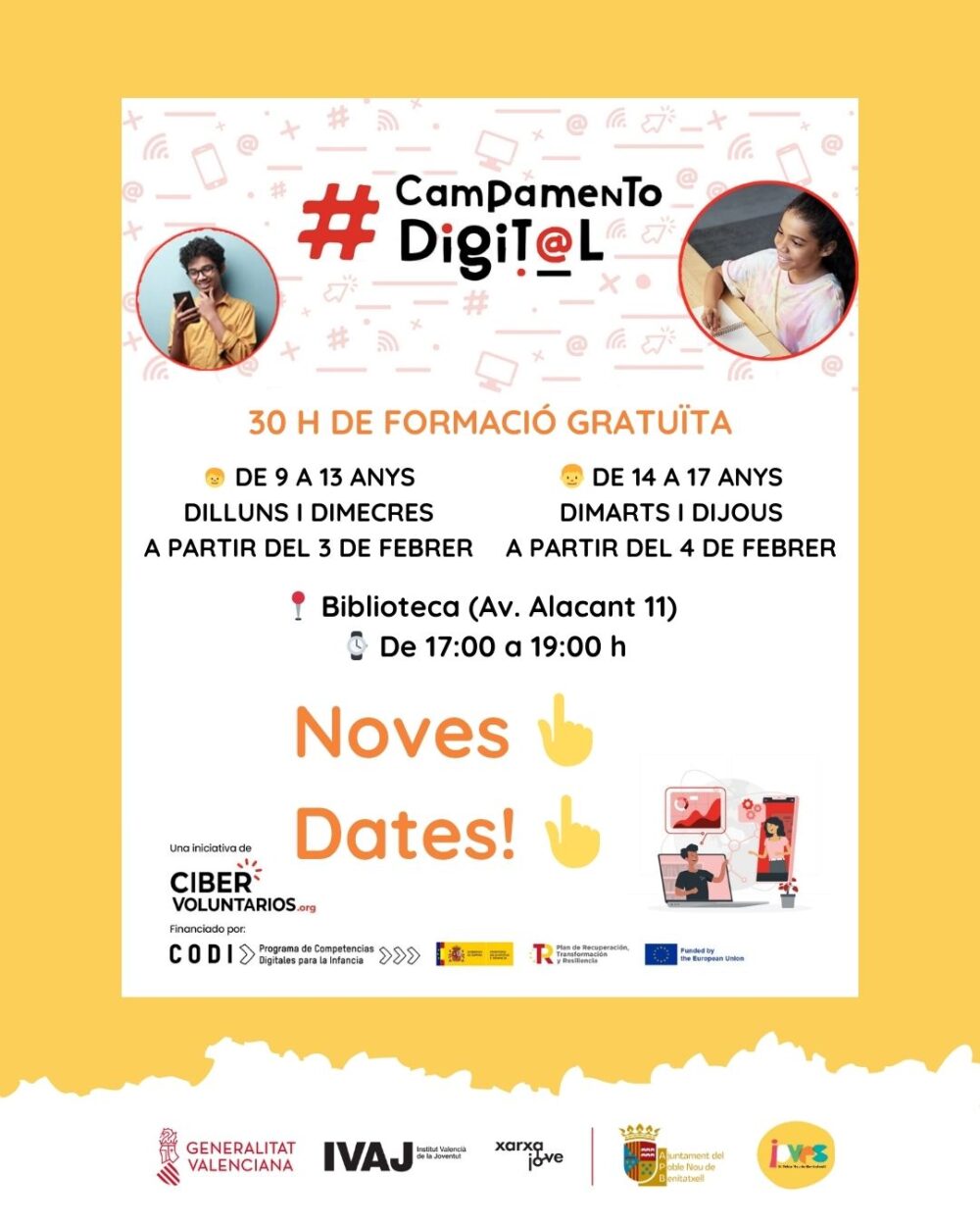Inscriptions are now open for the Fundación Cibervoluntarios Digital Camp at El Poble Nou de Benitatxell (Alacant) from July 7th to 18th for boys and girls between 12 and 14 years old. With specialised staff and contents adapted to each age group, the free activity will provide face-to-face training in digital skills from Monday to Friday (11:00am to 2:00pm) at the municipal library (Alacant Avenue, 11).