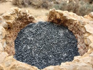 To protect the floor, a protective layer of geotextile was applied, followed by further layers of dark grey sand and gravel to symbolise the colour of the ashes of the oven and the colour of the tiles.