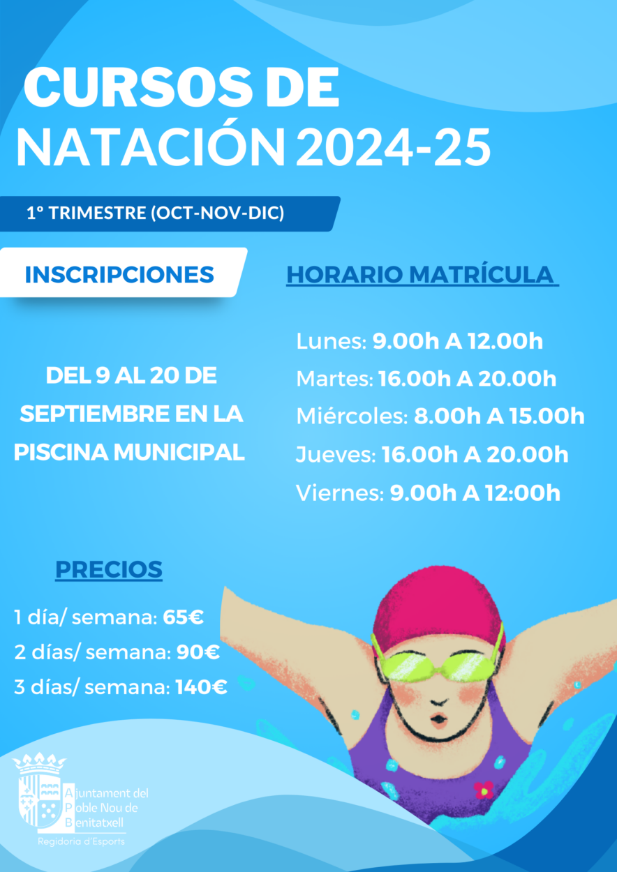 La Piscina Municipal abre, del 9 al 20 de septiembre, el periodo de inscripción a los cursos de natación y aquagym para el primer trimestre (octubre, noviembre y diciembre). Se pueden consultar los horarios de matriculación en el cartel.