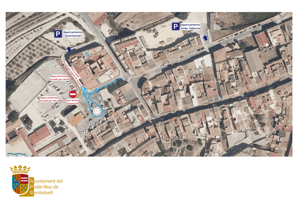Tanto el aparcamiento de la placeta dels Mestres como el de la calle de les Escoles a mano derecha estarán cerrados durante un tiempo, por lo que solo estará operativo el aparcamiento el de la subida a la izquierda. En este parking se instalará una miniglorieta para permitir el giro y la carga y descarga del alumnado. Por otro lado, también se está habilitando una nueva parcela en la calle Mestral para el aparcamiento.