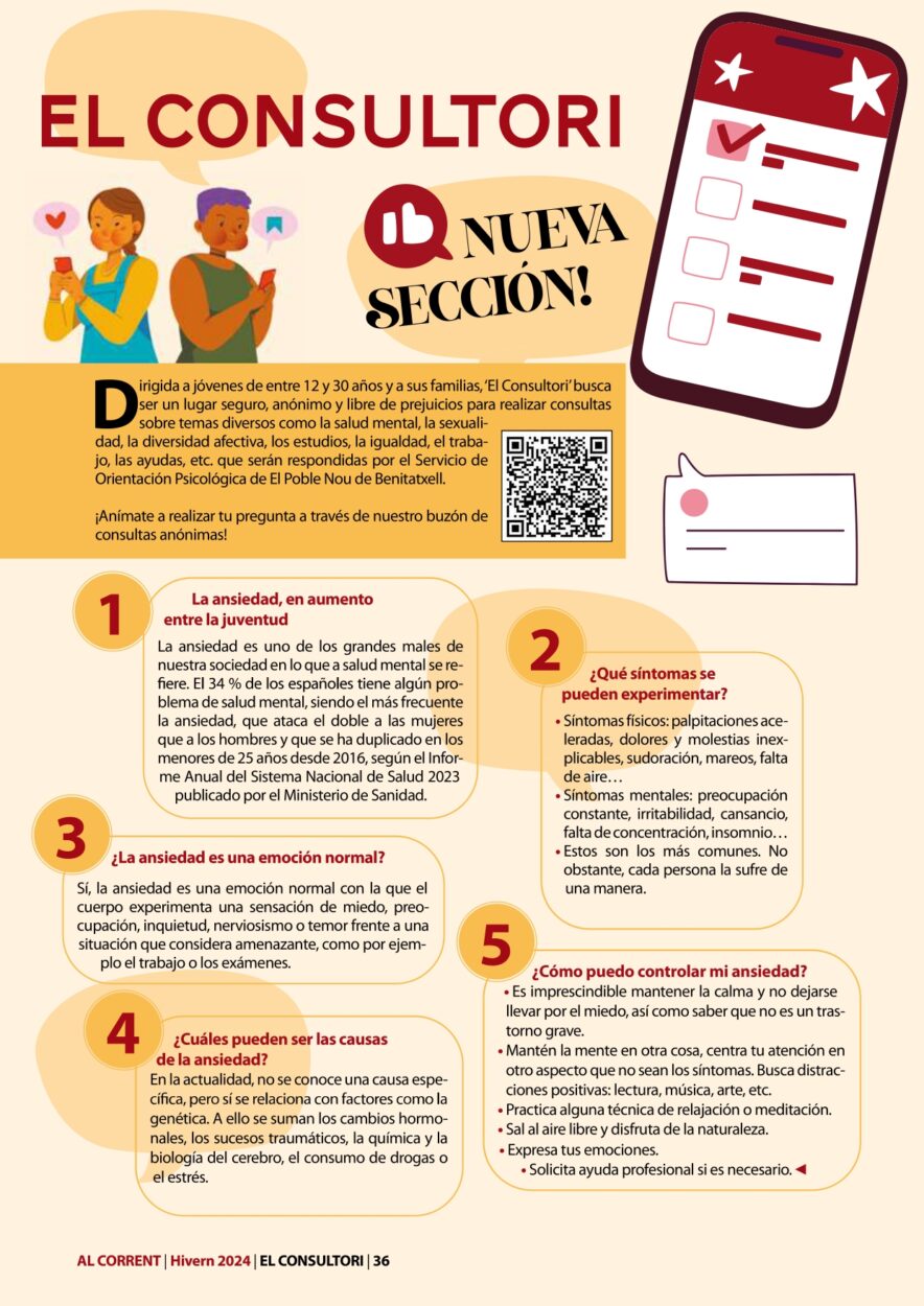 En esta primera edición de ‘El Consultori’, la sección centra su temática en la ansiedad, que cada vez está más en aumento entre la juventud. Se plantean y responden cuestiones como ¿la ansiedad es una emoción normal? ¿cuáles pueden ser las causas de la ansiedad? ¿qué síntomas se pueden experimentar? ¿cómo puedo controlar mi ansiedad? Con ello, se busca dar herramientas e información a las personas que la padecen para que puedan afrontarla de la mejor manera posible.