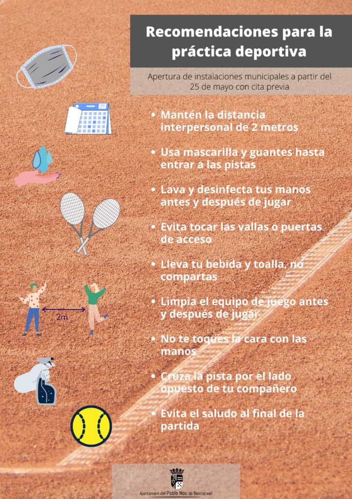 Para acceder a las instalaciones se implantará un sistema online de cita previa obligatoria. Las pistas se reservarán por una hora y posteriormente se dejará un espacio de media hora para su desinfección. Así, la disponibilidad es la siguiente: de 16:00 a 17:00h, de 17:30 a 18:30h, de 19:00 a 20:00h y de 20:30 a 21:30h. Se puede consultar la disponibilidad de las pistas en https://www.elpoblenoudebenitatxell.com/es/areas/departamentos/deportes.