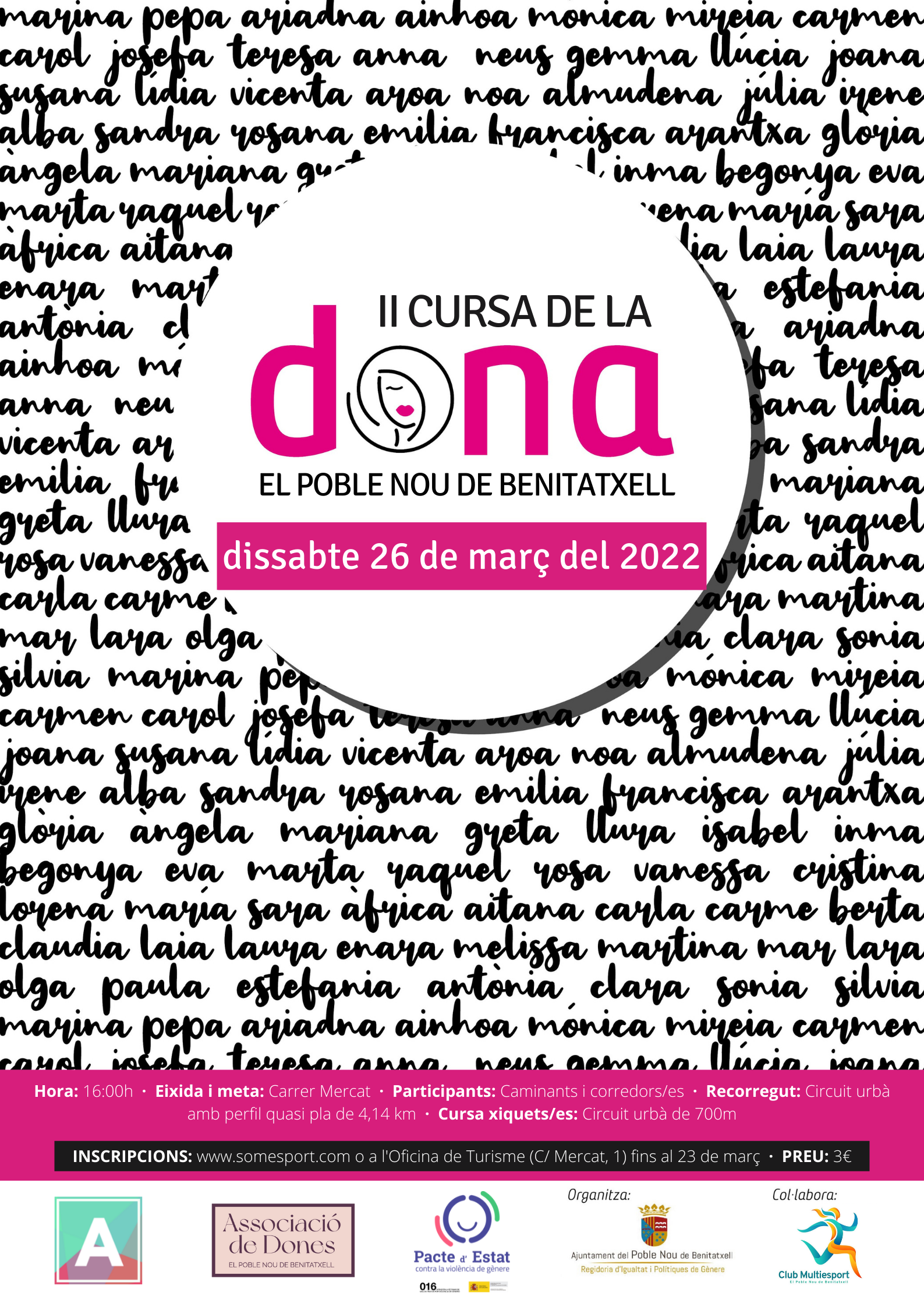 El Poble Nou de Benitatxell se mueve un año más por la igualdad. Este sábado 26 de marzo, a partir de las 16:00h, se celebrará la II Cursa de la Dona. Las pobleras, pobleros y personas de la comarca se calzarán las zapatillas de deporte y caminarán o correrán por la igualdad efectiva, pero además lo harán por una causa solidaria, ya que los fondos recaudados irán destinados a Aprosdeco (Asociación Pro-Deficientes Psíquicos de Dénia y Comarca Marina Alta), que trabaja para impulsar y poner al alcance de las personas con diversidad funcional todos los recursos para mejorar su calidad de vida.