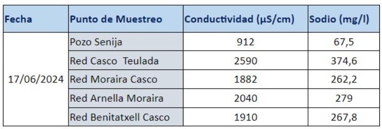 Després de les mostres d’aigua preses a diversos punts de la xarxa per Hidraqua, la concessionària d’aigua potable del Consorci d’Aigües Teulada – Benitatxell, i dels resultats analítics obtinguts en base a la legislació tècnic sanitària vigent (RD 3/2023), l’Ajuntament pot afirmar que la qualitat de l’aigua al Poble Nou de Benitatxell és de “POTABILITAT amb un excés, dins dels llindars permesos, del paràmetre sodi”. És la definició tècnica emesa pel Centre de Salut de Dénia, organisme públic competent en matèria d’aigua potable. Els resultats s’adjunten en la taula de la imatge.