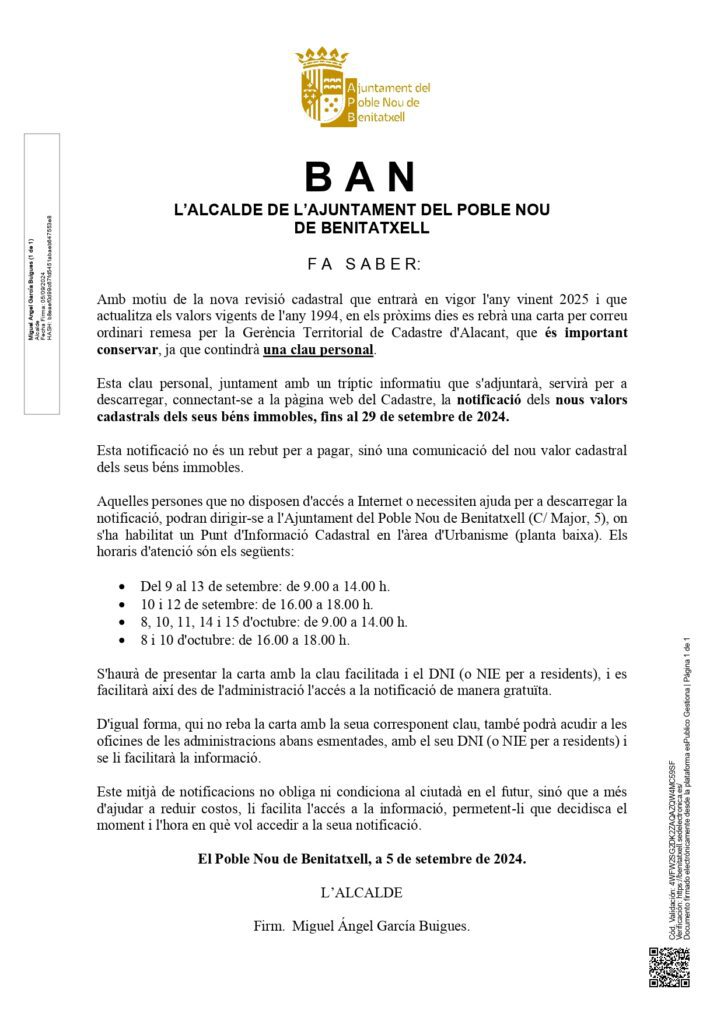 Amb motiu de la nova revisió cadastral que entrarà en vigor l’any vinent 2025 i que actualitza els valors vigents de l’any 1994, en els pròxims dies es rebrà una carta per correu ordinari remesa per la Gerència Territorial de Cadastre d’Alacant, que és important conservar, ja que contindrà una clau personal.