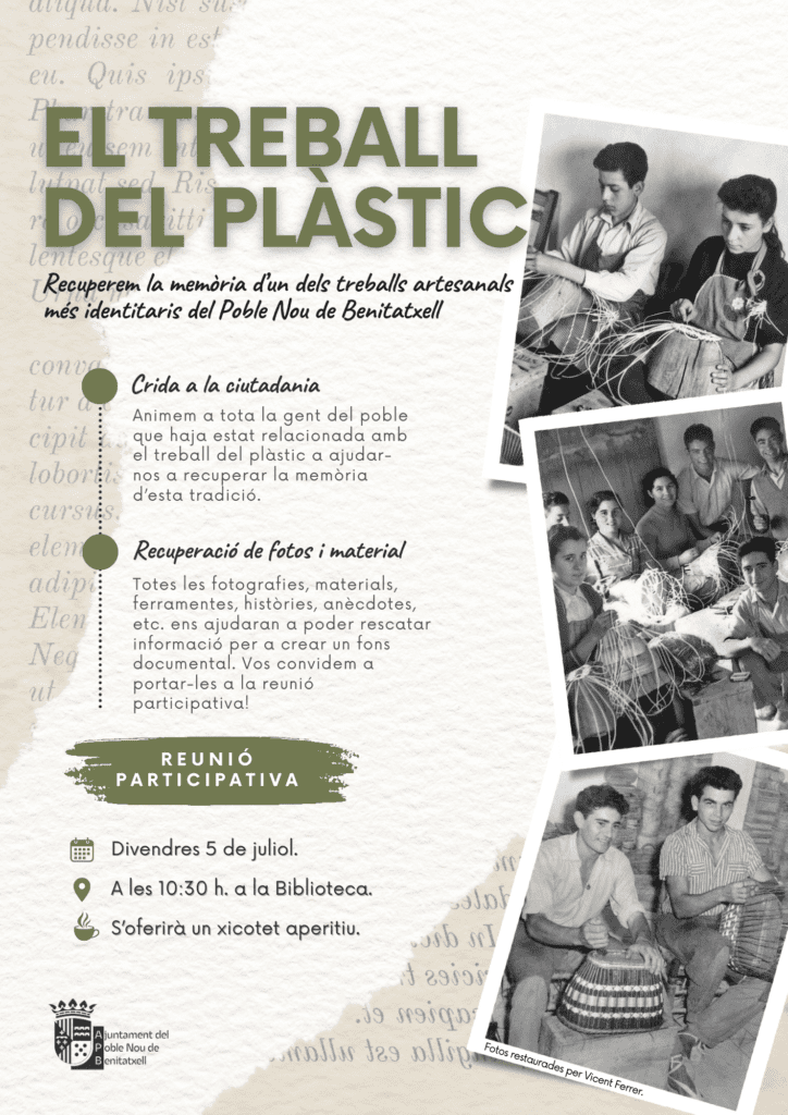 “Animem a tota la gent que haja estat relacionada amb el treball del plàstic a ajudar-nos a recuperar la memòria d’esta tradició tan particular i identitària del nostre poble, bé siga aportant els seus records i informació, o bé fotografies, materials, ferramentes, etc.”, ha apel·lat el regidor de l’àrea, Víctor Bisquert. L’objectiu principal, ha explicat, és crear un fons documental i recopilar tota la informació possible sobre este ofici abans que desapareguen els testimonis orals que hi van participar d’ell en primera persona.